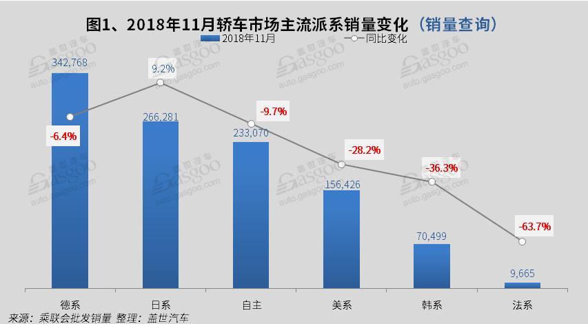 根据盖世汽车研究院整理的数据,2018年11月,乘用车市场销量214.3万辆同比下跌16.1%,全年累计销量2107.1万辆同比下跌2.5%。国内轿车销量108.5万辆,同比下跌11.9%,跌幅扩大,轿车在乘用车市场的销量占比达51%。
