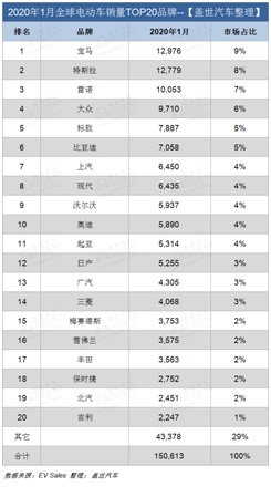 销量TOP 20 品牌:特斯拉失守 宝马夺冠