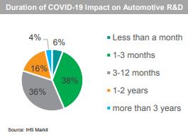 亚洲(特别是中国)的企业表示,疫情将对汽车业研发投入有着长期的影响(超过3年);而大多数北美的企业则表示影响在三个月内即会消失。OEM的态度更为乐观,较高比例的OEM认为疫情对研发投入的影响只有三个月或者更少。