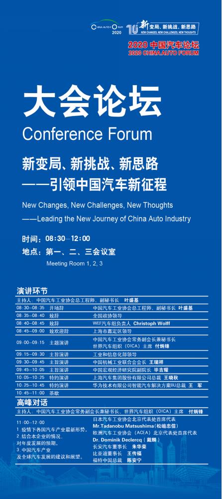 作为2020中国汽车论坛的战略合作企业,上海汽车集团股份有限公司总裁王晓秋与华为技术有限公司智能汽车解决方案BU总裁王军也将进行特约演讲。