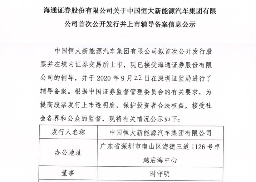 10月19日,据深圳证监局官方消息,中国恒大新能源汽车集团有限公司(以下简称恒大汽车)拟首次公开发行股票并在境内证券交易所上市,已于今年9月22日在深圳证监局进行了辅导备案,现已接受海通证券股份有限公司的辅导。