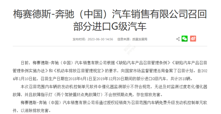 梅赛德斯-奔驰(中国)汽车销售有限公司召回部分进口G级汽车