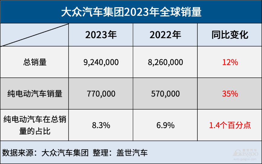尽管大众汽车集团的高管们在近几个月警告称,电动汽车需求并未像预期的那样发展,但该集团2023年在全球的纯电动汽车销量同比增长35%,达到77万辆。