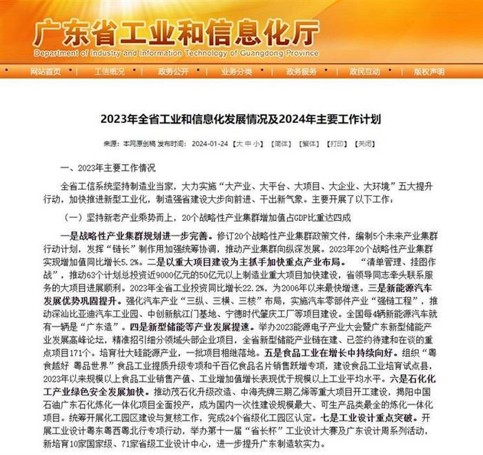 2024年主要工作计划中提出,广东省将巩固提升优势产业领先地位。推动电子信息、绿色石化、智能家电、汽车、超高清视频显示等规模大、实力强的优势产业大步向前,立稳广东产业“顶梁柱”。要加快新一代电子信息产业高质量发展。充分发挥“链长制”作用,深化各区域产业分工协作,着力突破重大技术缺失和薄弱环节,支持企业供应链多元化,依托高新区、产业基地等发展载体,培育若干新一代电子信息特色产业园区。要扩大汽车产业优势。继续实施汽车零部件产业“强链工程”,支持新能源汽车龙头企业打造品牌、拓展海外市场、提高单车利润,引导燃油车企业加快电动化智能化网联化发展,持续推进车联网先导区建设。