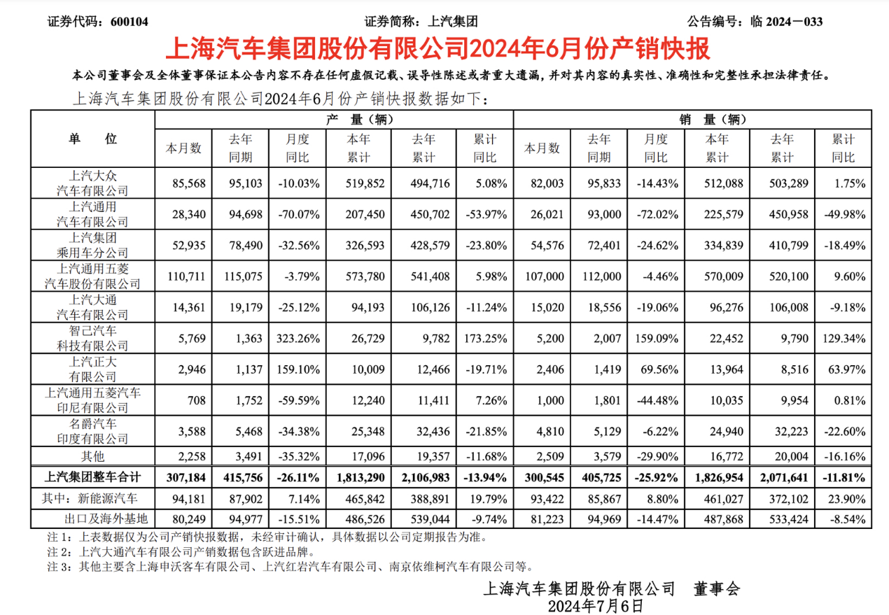 据上汽集团公布的产销快报显示,6月,上汽集团整车合计产量307184辆,同比减少26.11%,上半年累计产量1813290辆,同比减少13.94%。