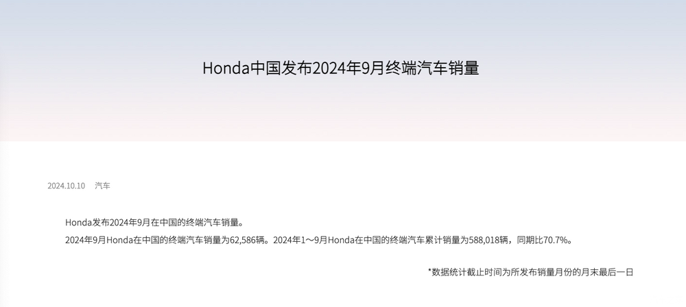 1-9月累计销量588018辆 本田9月中国市场销量62586辆