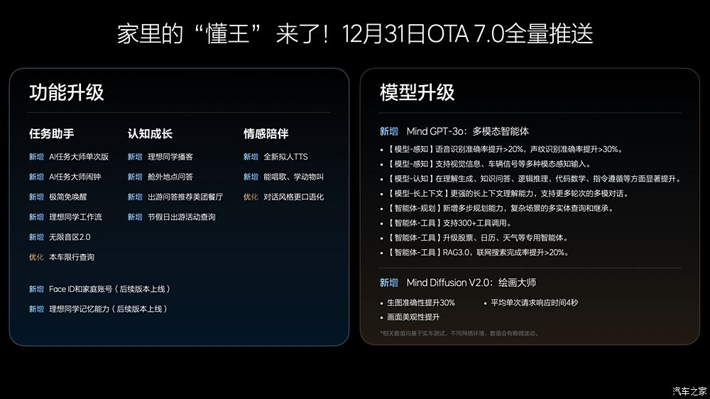 12月27日,理想汽车连续三天推出“2024理想 AI Talk”,分享了对人工智能的最新思考,以及包含智能驾驶和理想同学在内的人工智能技术的最新进展。李想宣布基于自研基座大模型Mind GPT的理想同学从车机进入手机,App已于12月27日全量上线。此外,理想汽车宣布OTA 7.0版本车机系统将于12月底全量推送AD Max用户,新增AI推理可视化、高速端到端等功能,并实现Mind GPT-3o、Mind Diffusion V2.0的能力升级。