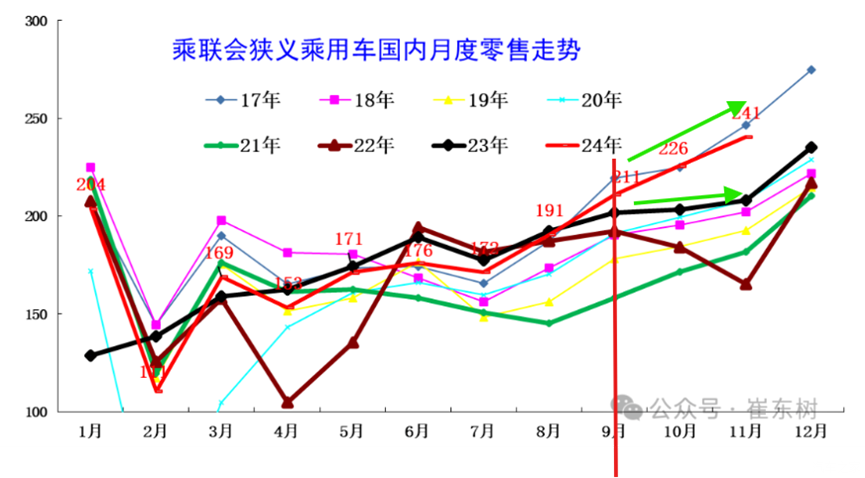 下图看2024年销量的红色线,在9月份后大幅拉升走势陡峭,和往年走势迅速分化,仅次于2017年。